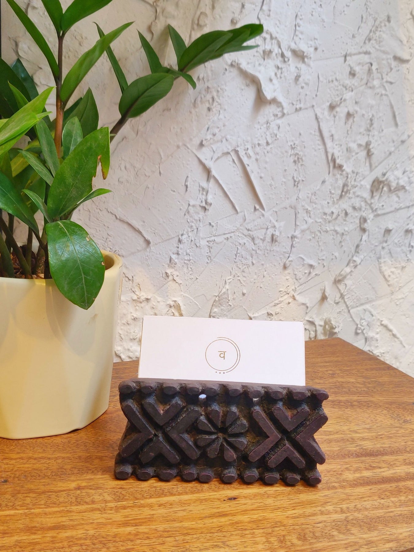 Our upcycled wooden block card holder is crafted from authentic block printing blocks, giving discarded art a second life — a perfect blend of heritage and utility for your desk or table.