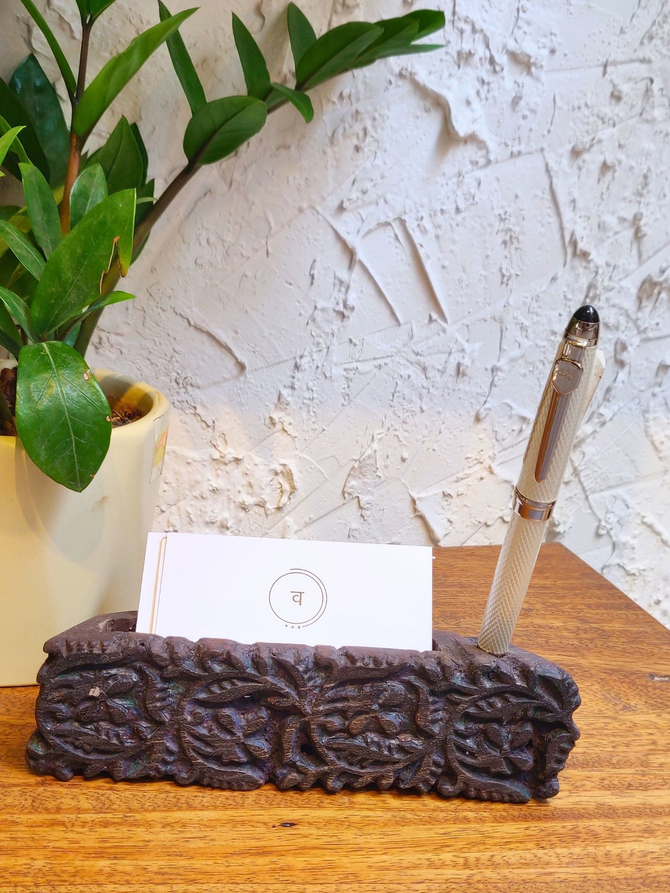 Our upcycled wooden block card holder is crafted from authentic block printing blocks, giving discarded art a second life — a perfect blend of heritage and utility for your desk or table.