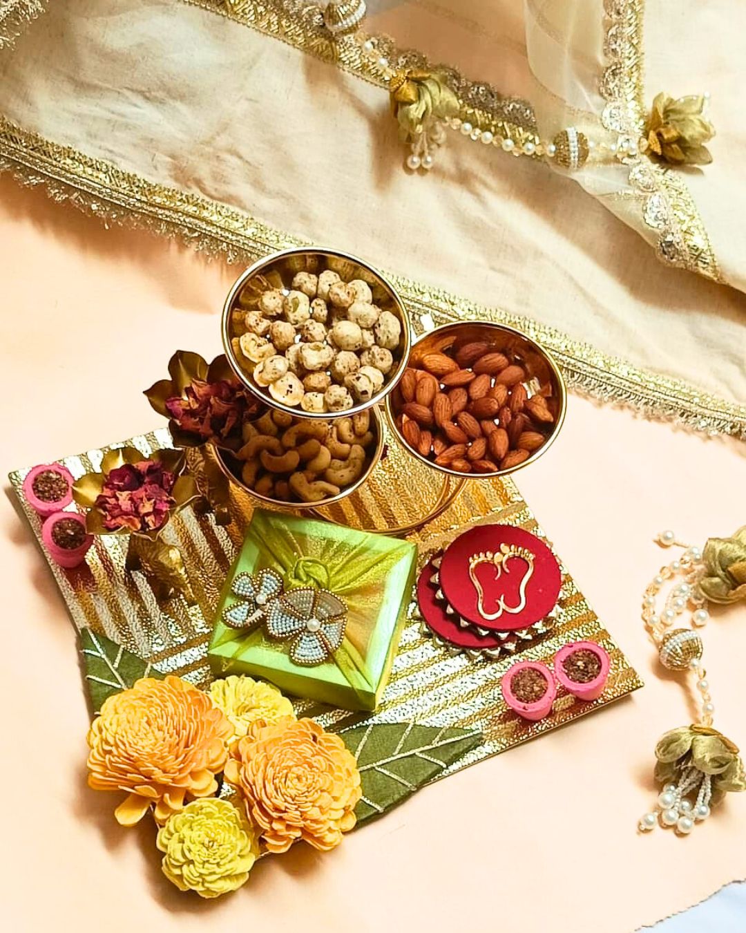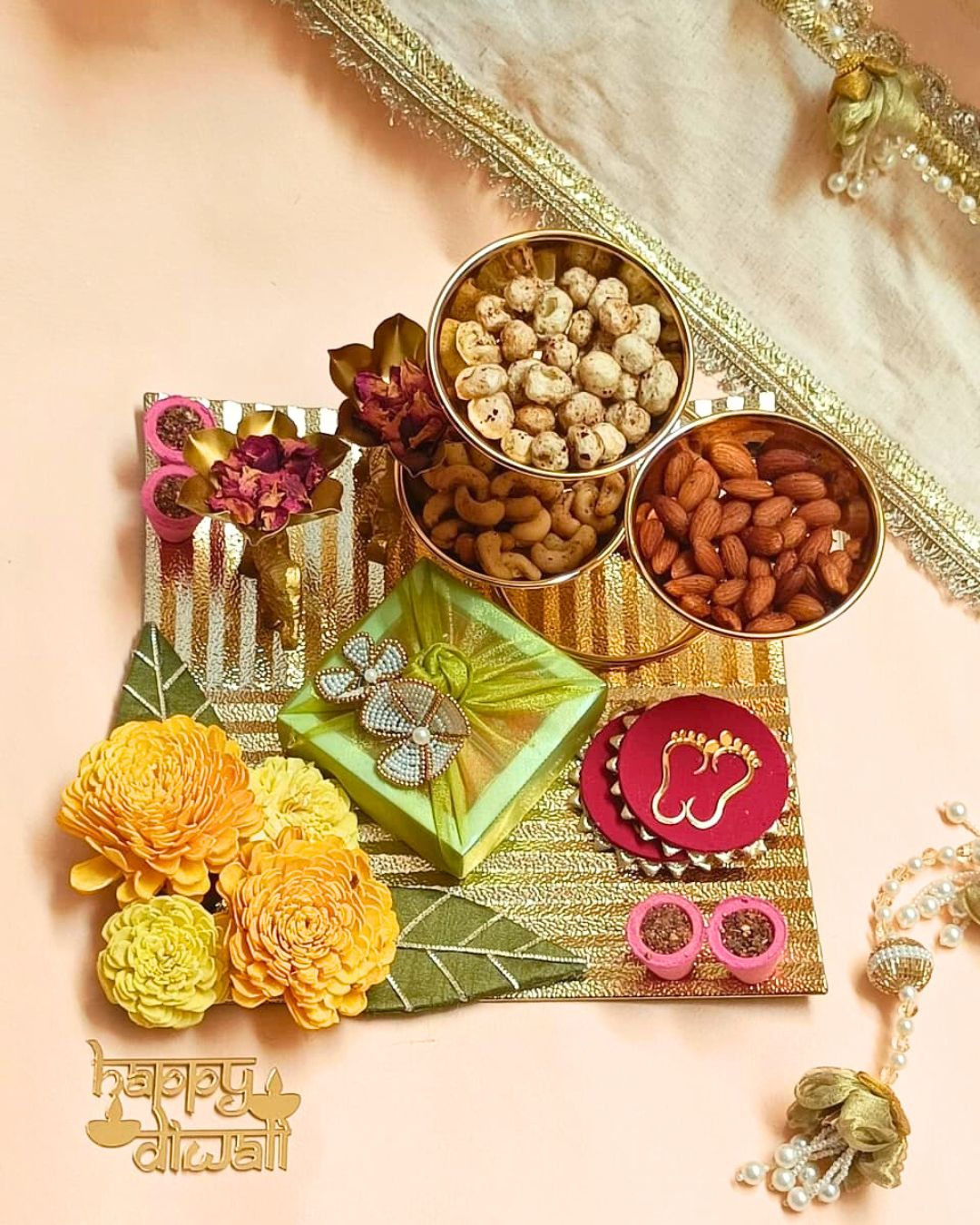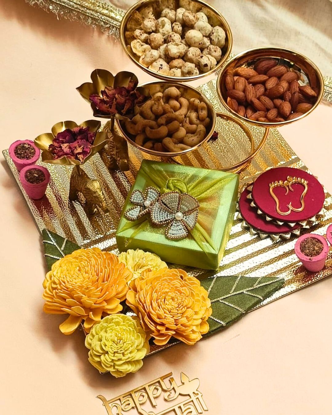 Bringing together blessings and indulgence – a dry fruit basket for health, an elephant T-light holder for prosperity, Lakshmi charan for divine grace, and hawan cups for pure positive vibes. Perfect for gifting light and love this festive season