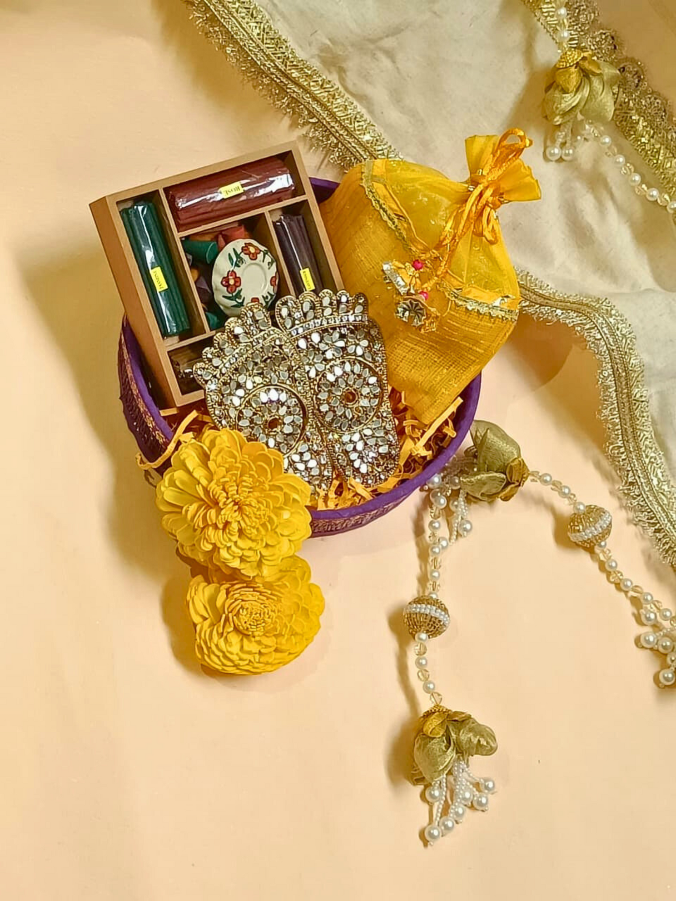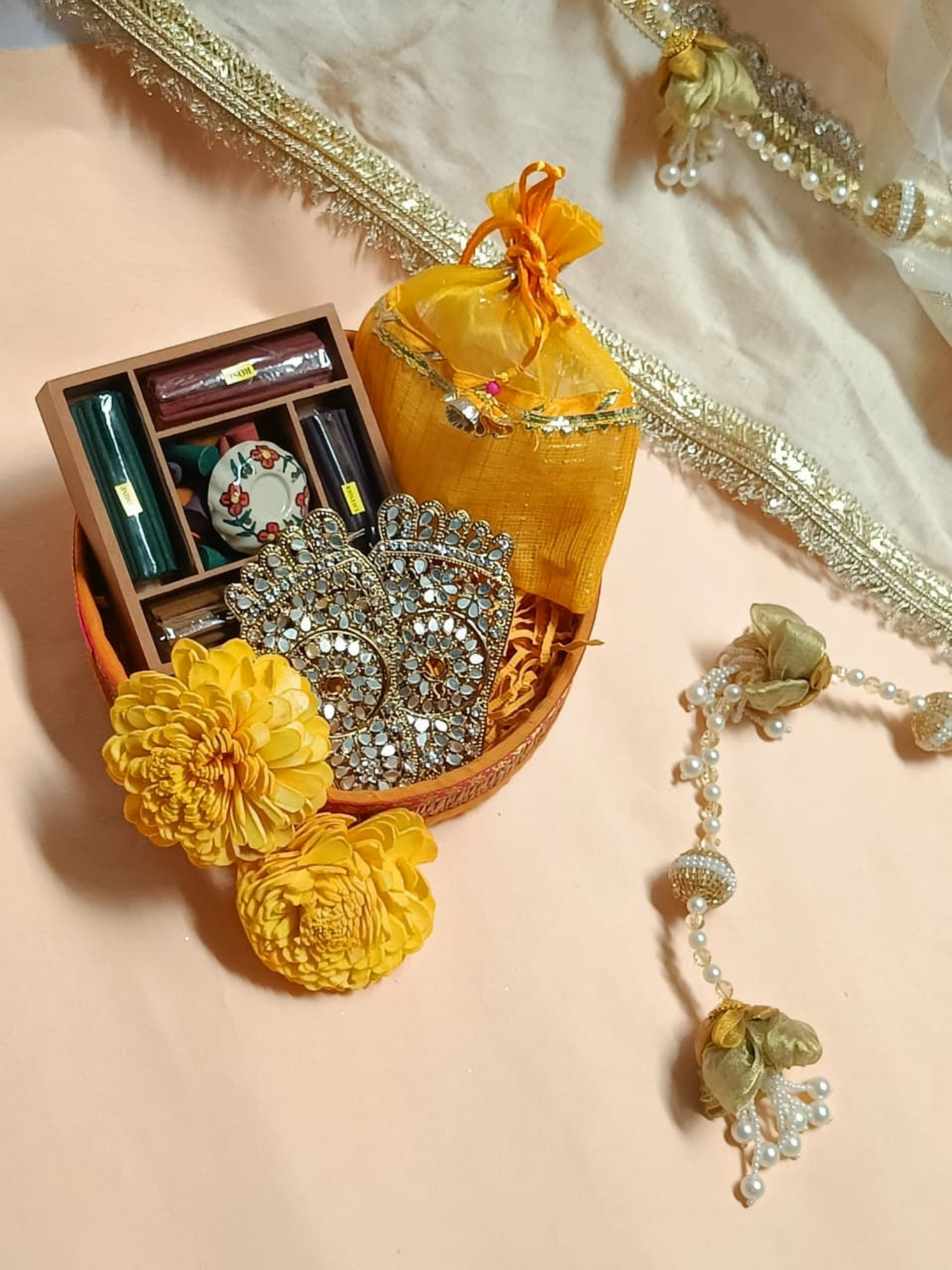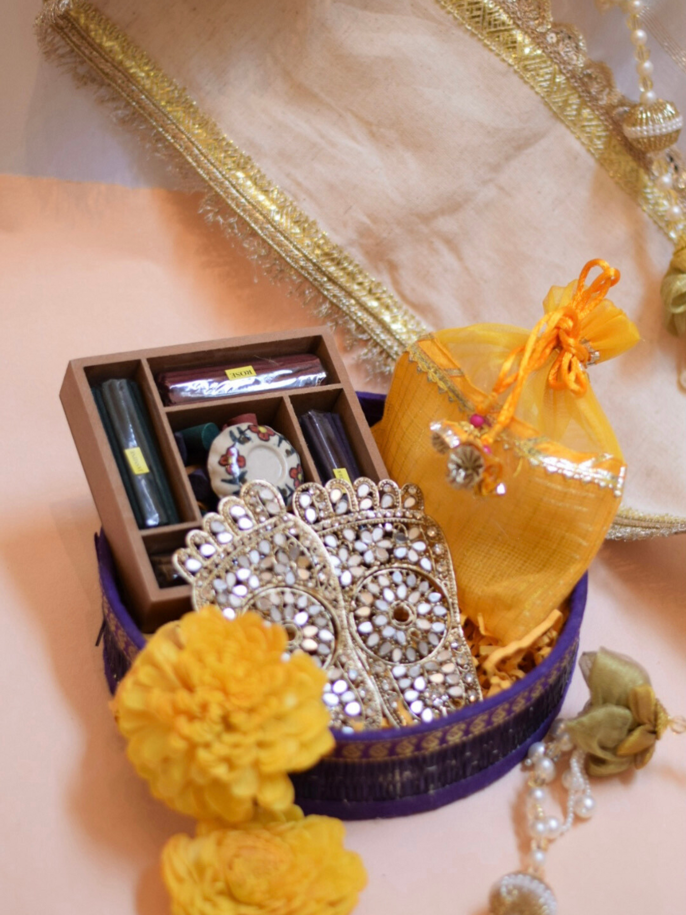 “A perfect Diwali basket of love & light – with a mirror Lakshmi, mirror diya, dhoop batti set, and a potli of premium dry fruits for festive abundance.