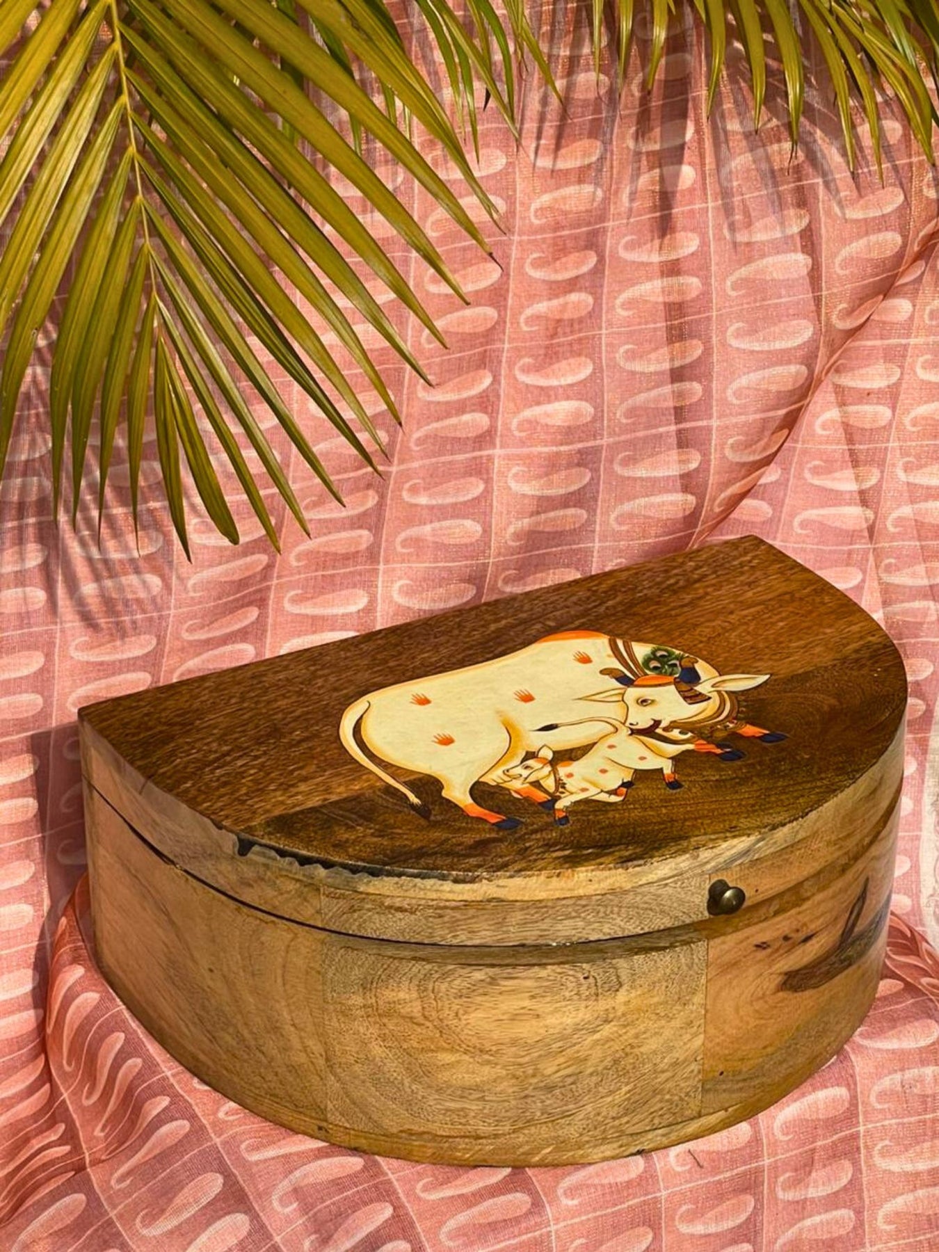 Crafted in wood and painted with traditional Pichwai detailing, the cow and calf represent purity, devotion and the eternal bond of mother and child.