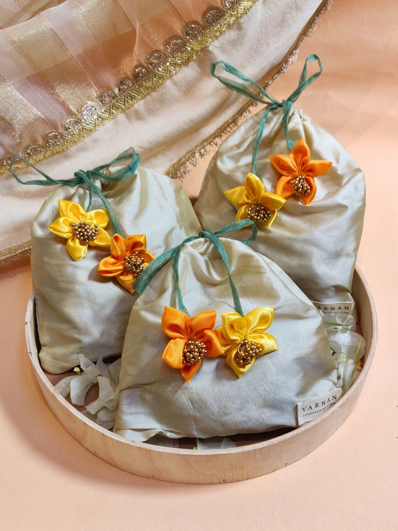 Wrapped in blooms, tied with grace — a potli that blossoms with every detail.