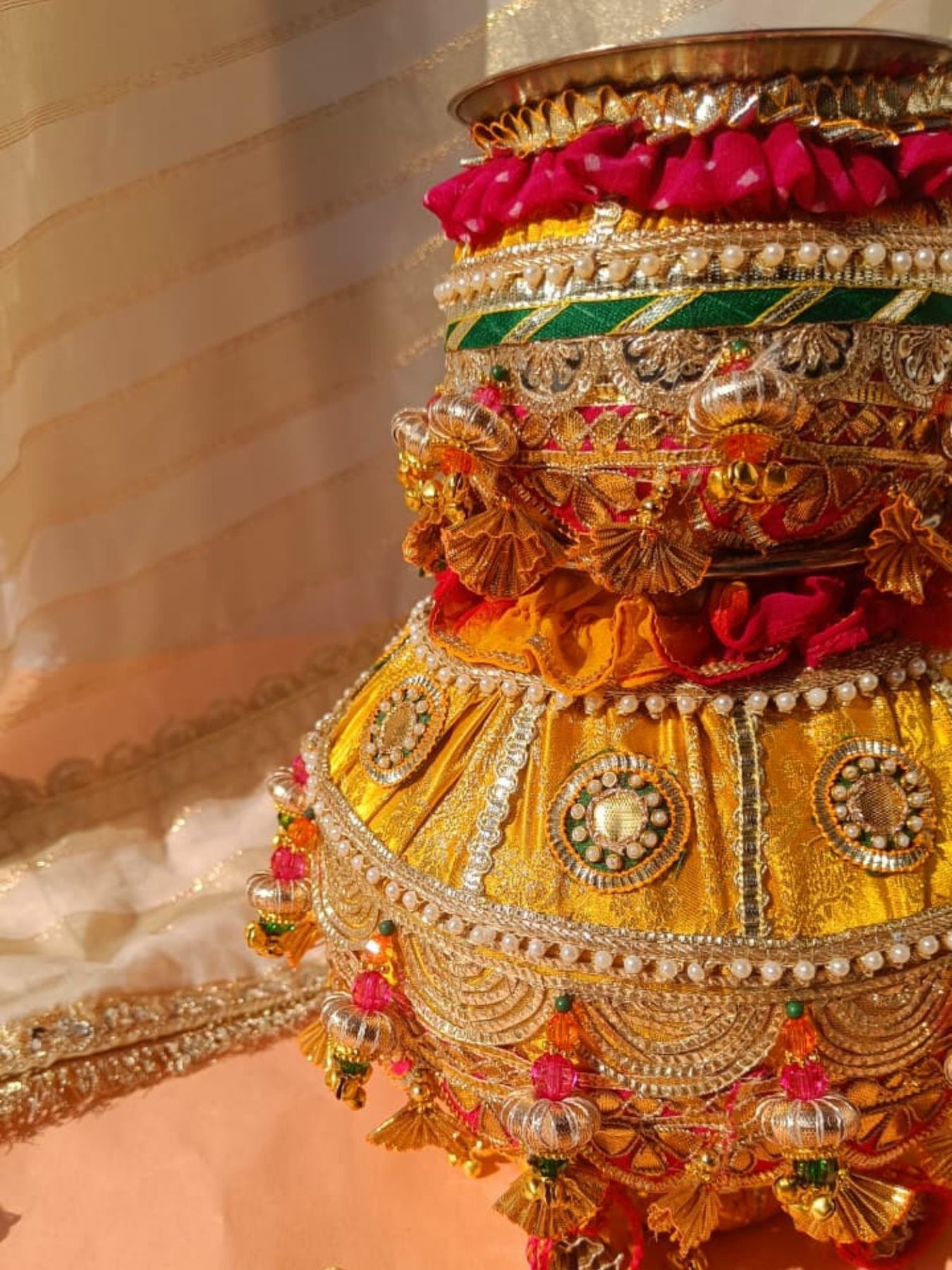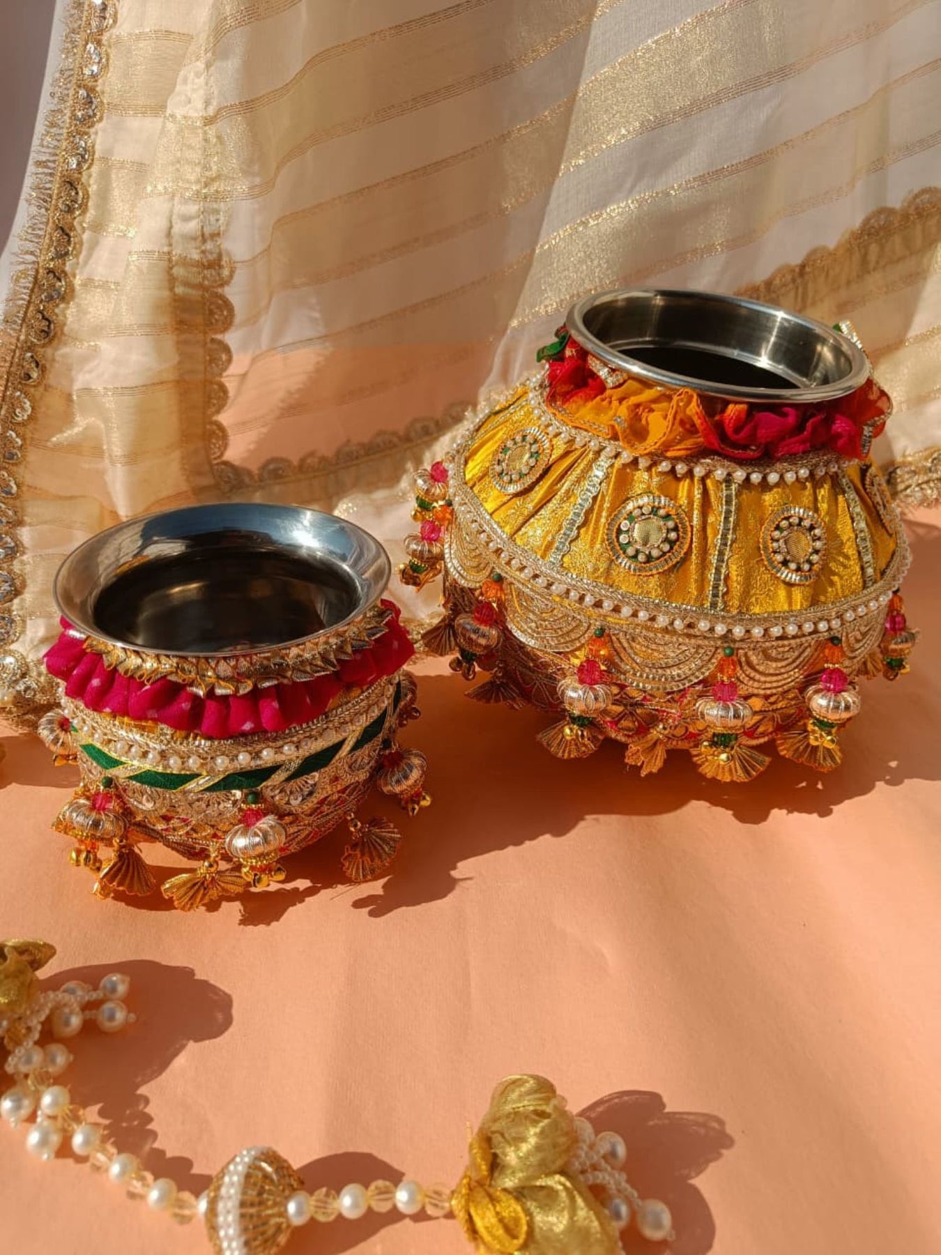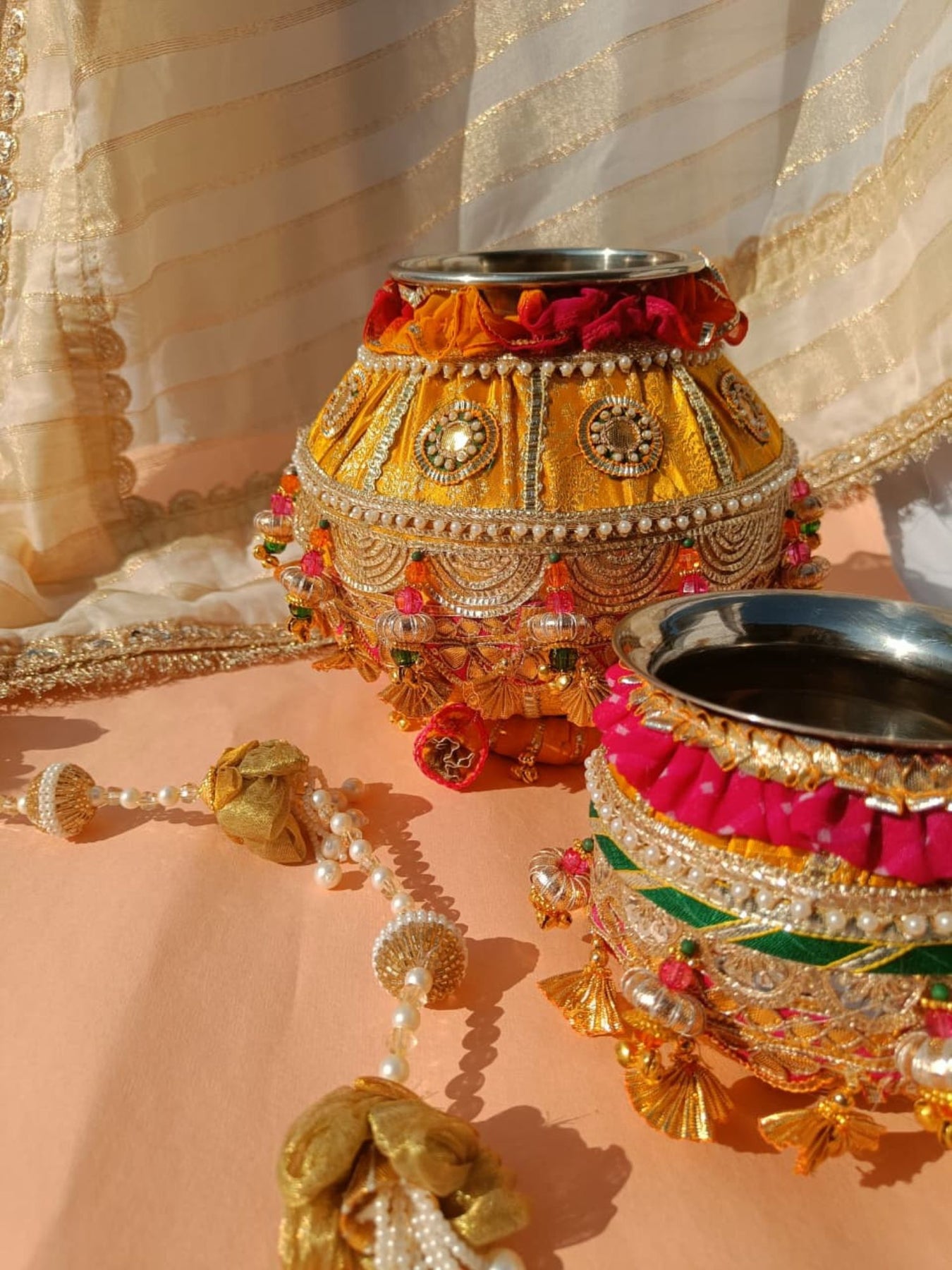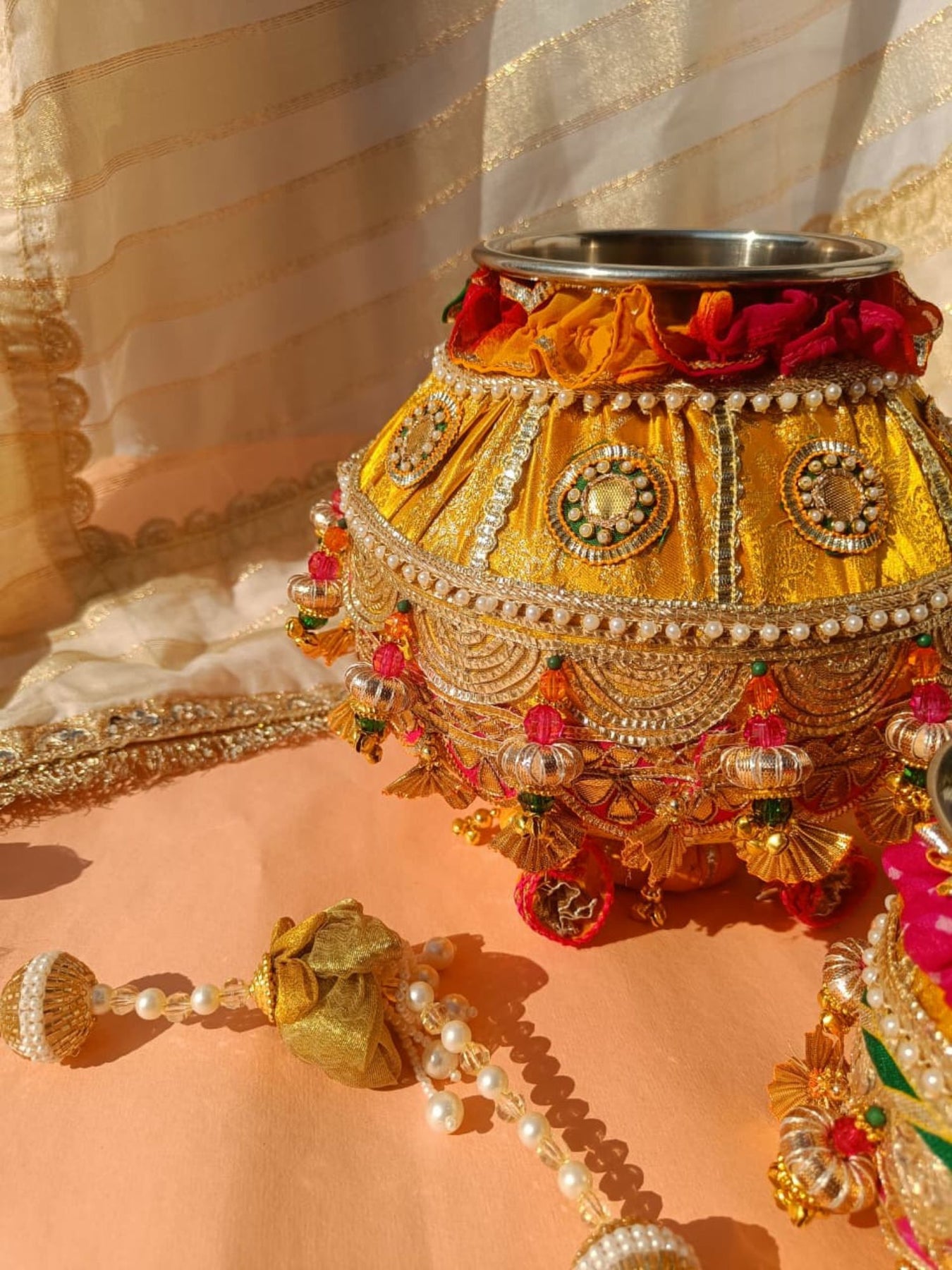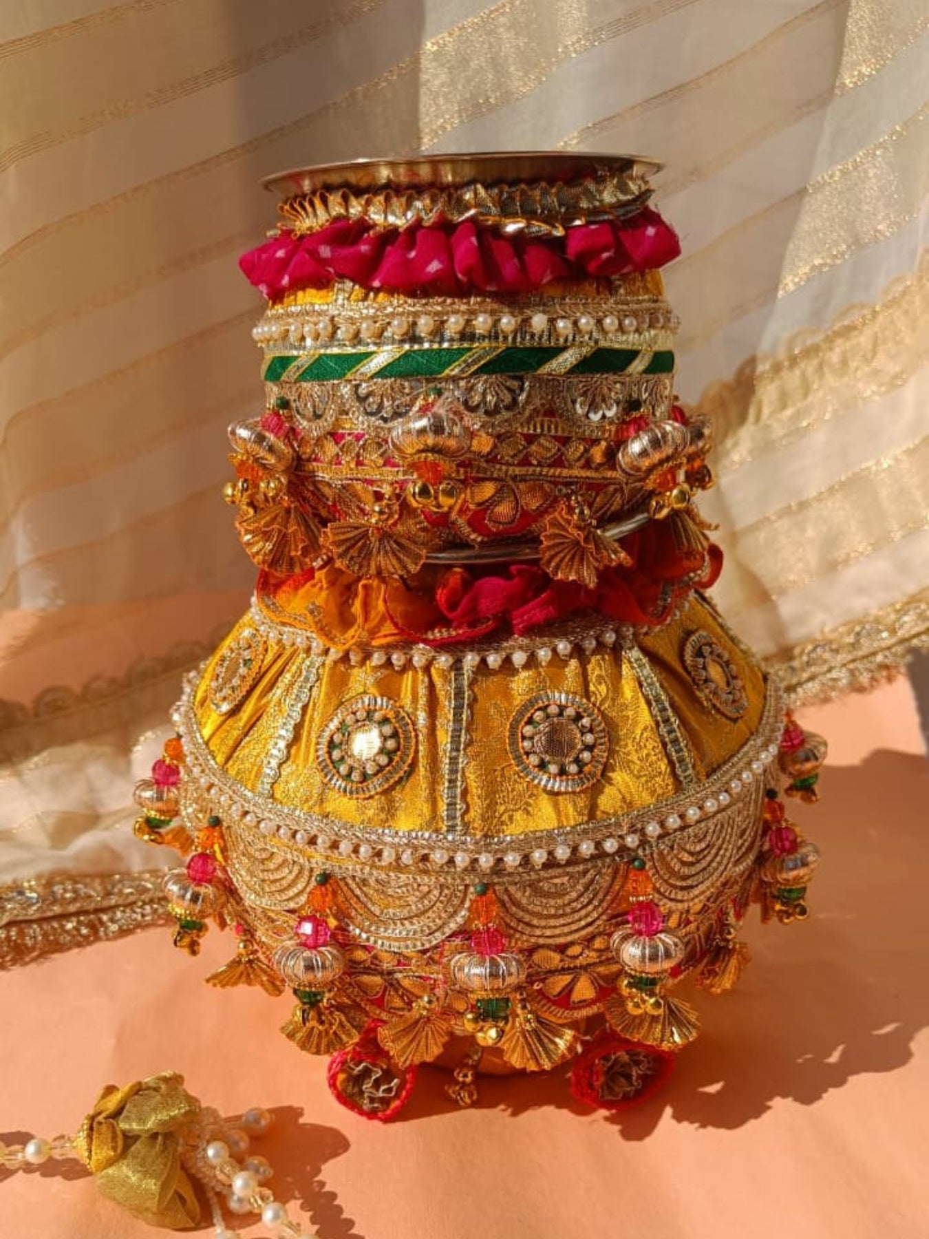 Our shaadi ki matki is beautifully decorated with gota, pearls, flowers, and tassels—perfect for your wedding rituals and ceremonies. Add a traditional touch with elegant detailing crafted with love.
