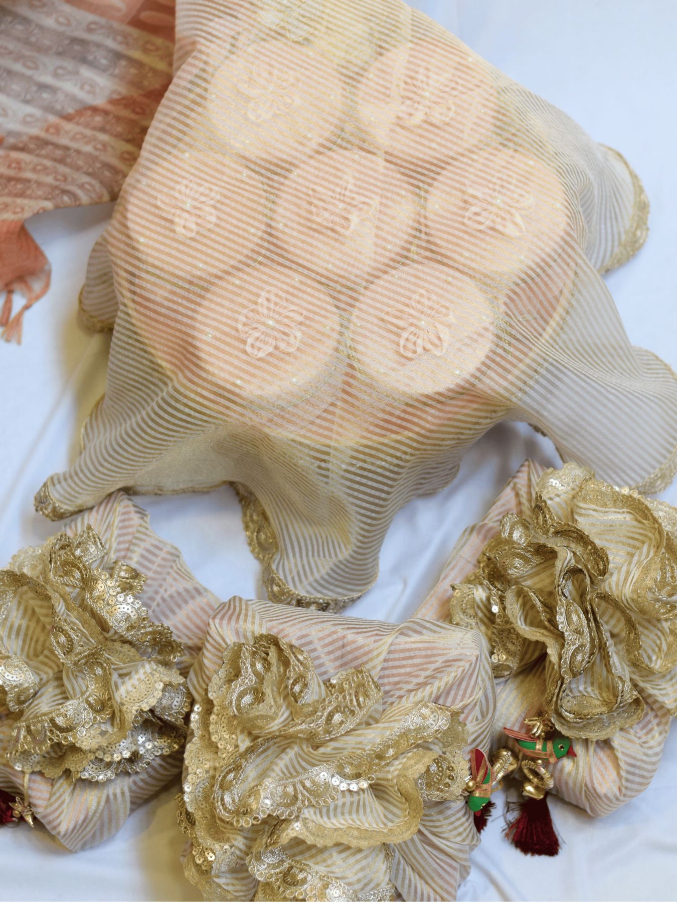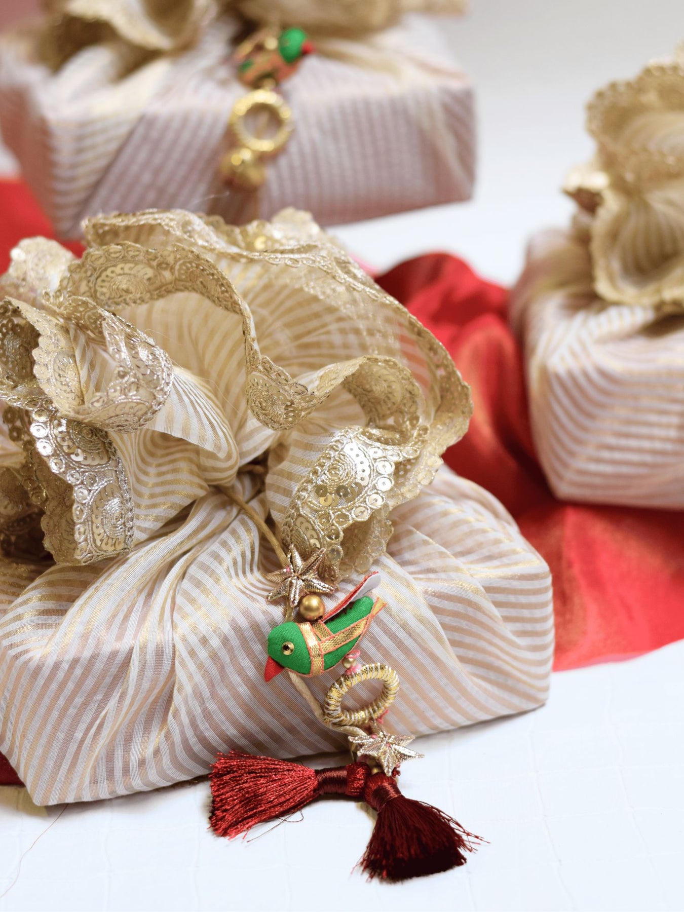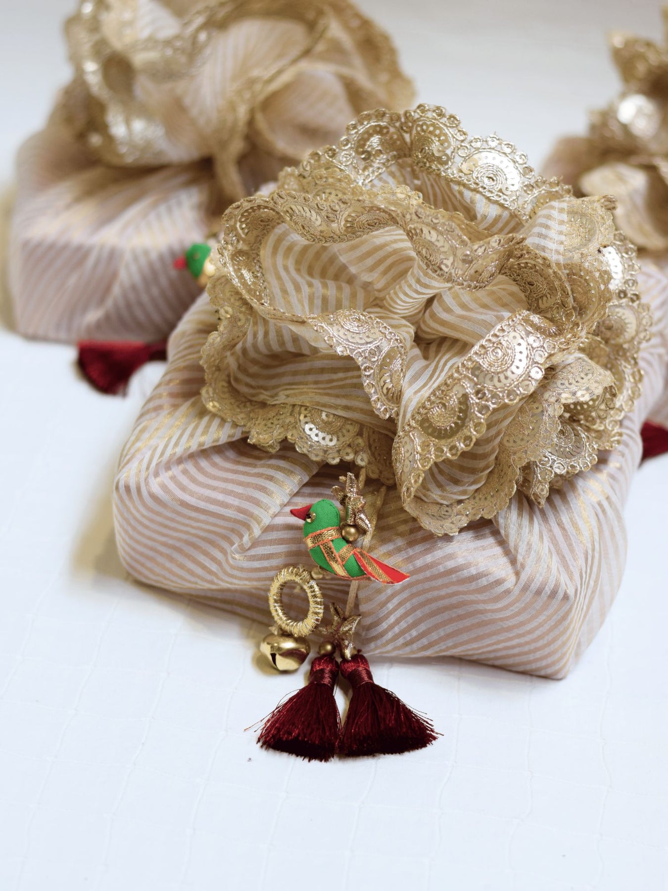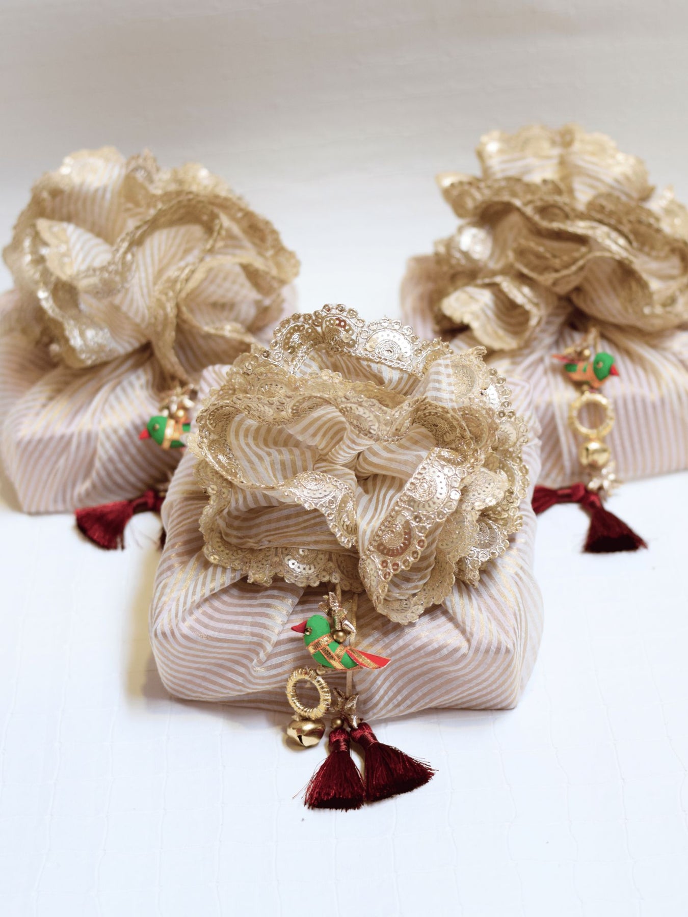 When gifting meets reusability! This mithai box wrapped in luxe white–gold fabric and finished with a tassel + gota lace can be reused as a stunning thaal posh.