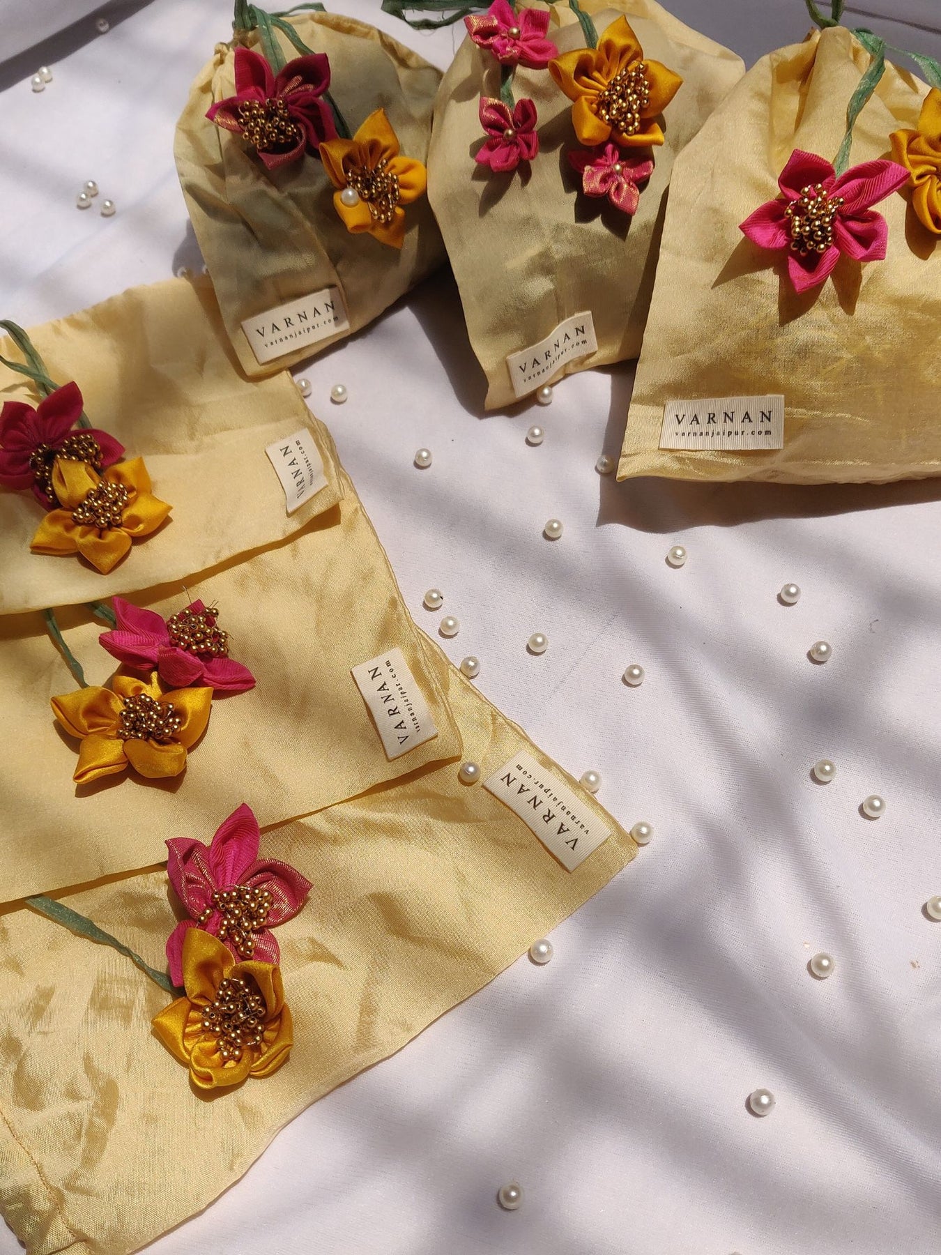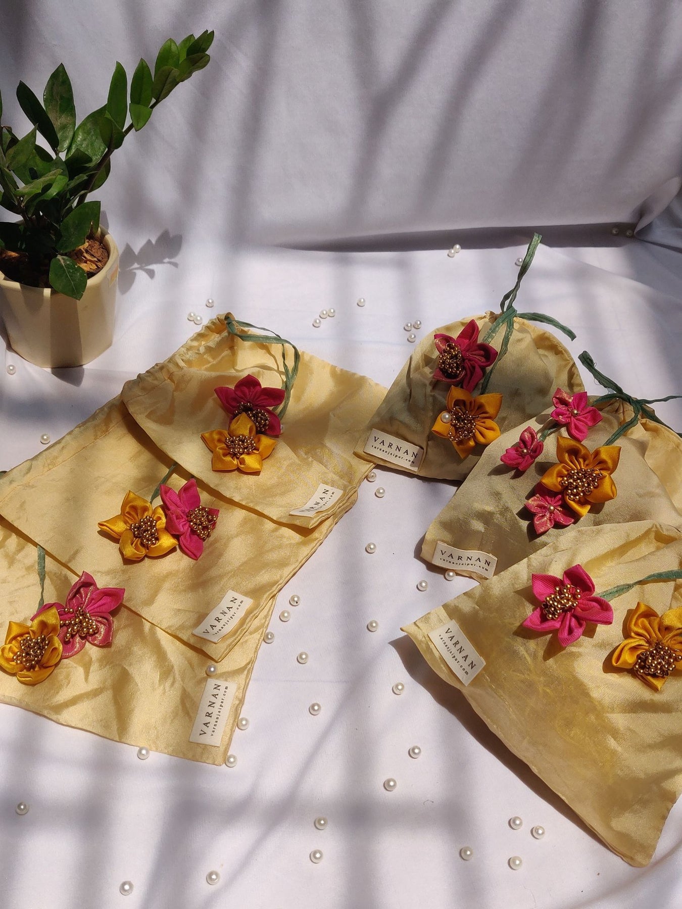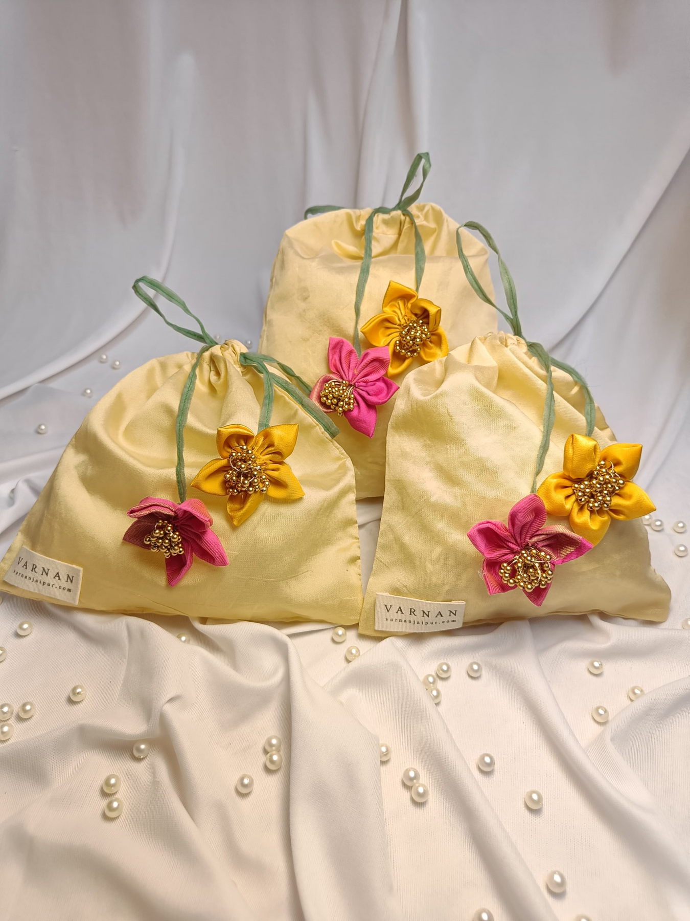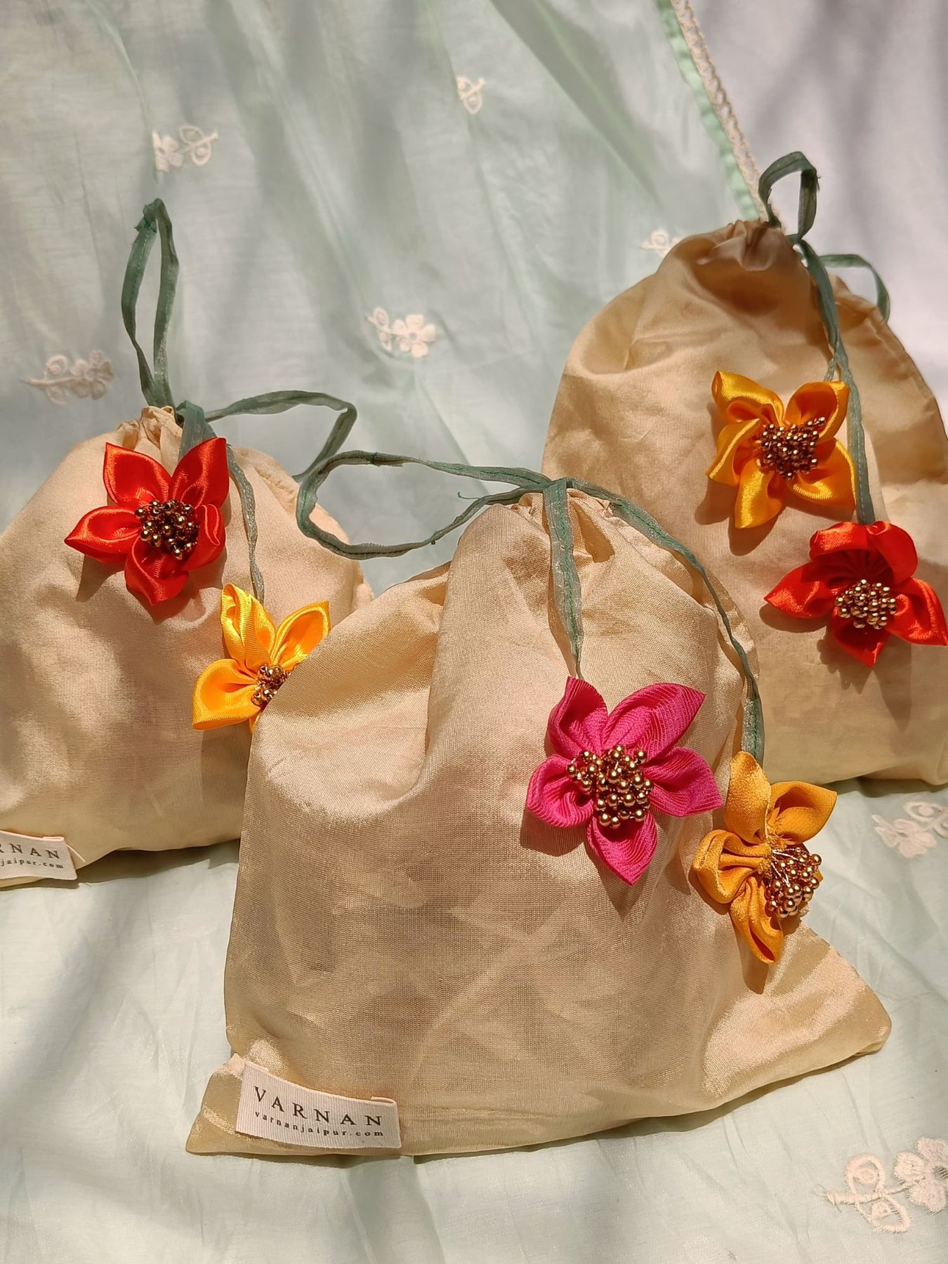 Wrapped in blooms, tied with grace — a potli that blossoms with every detail.