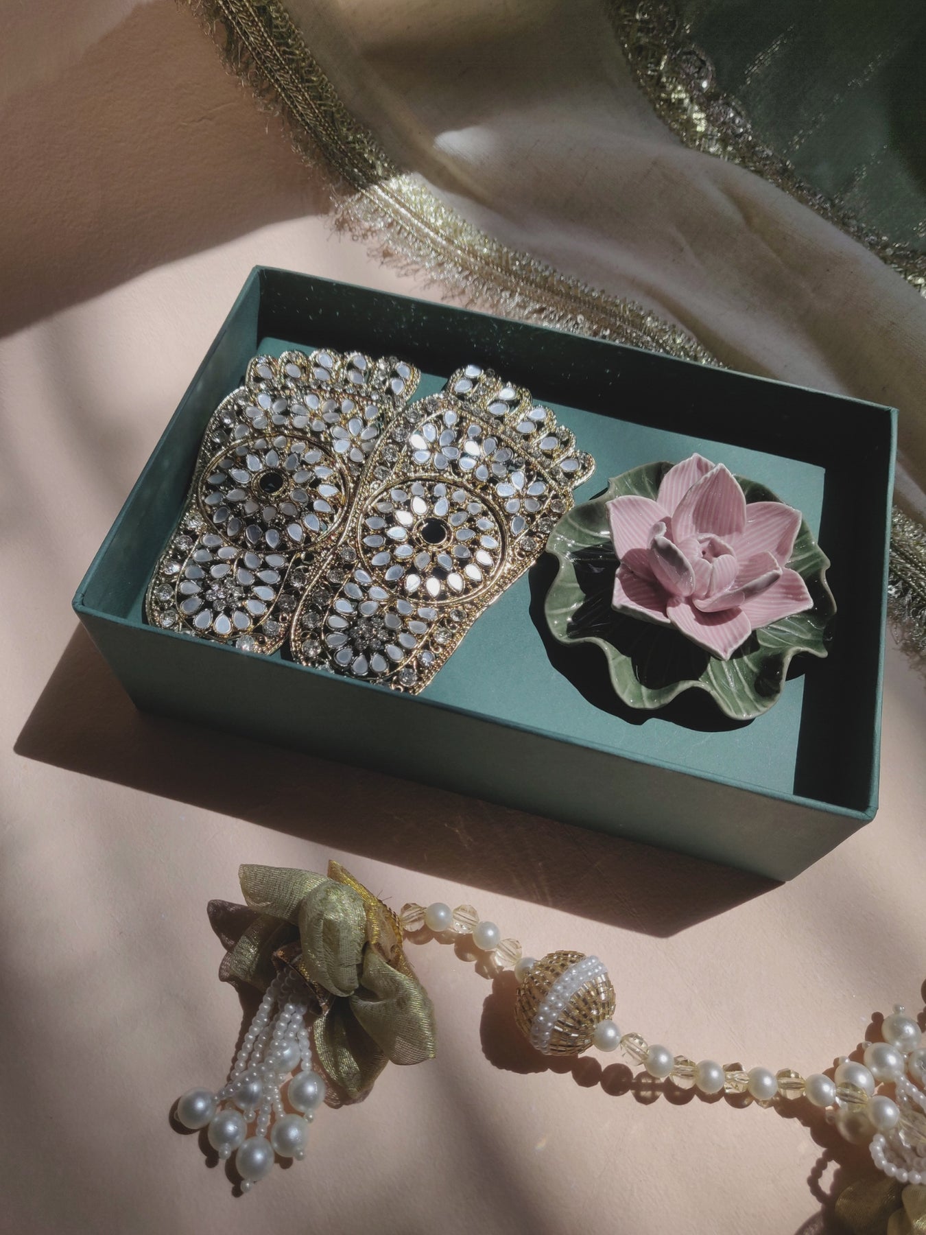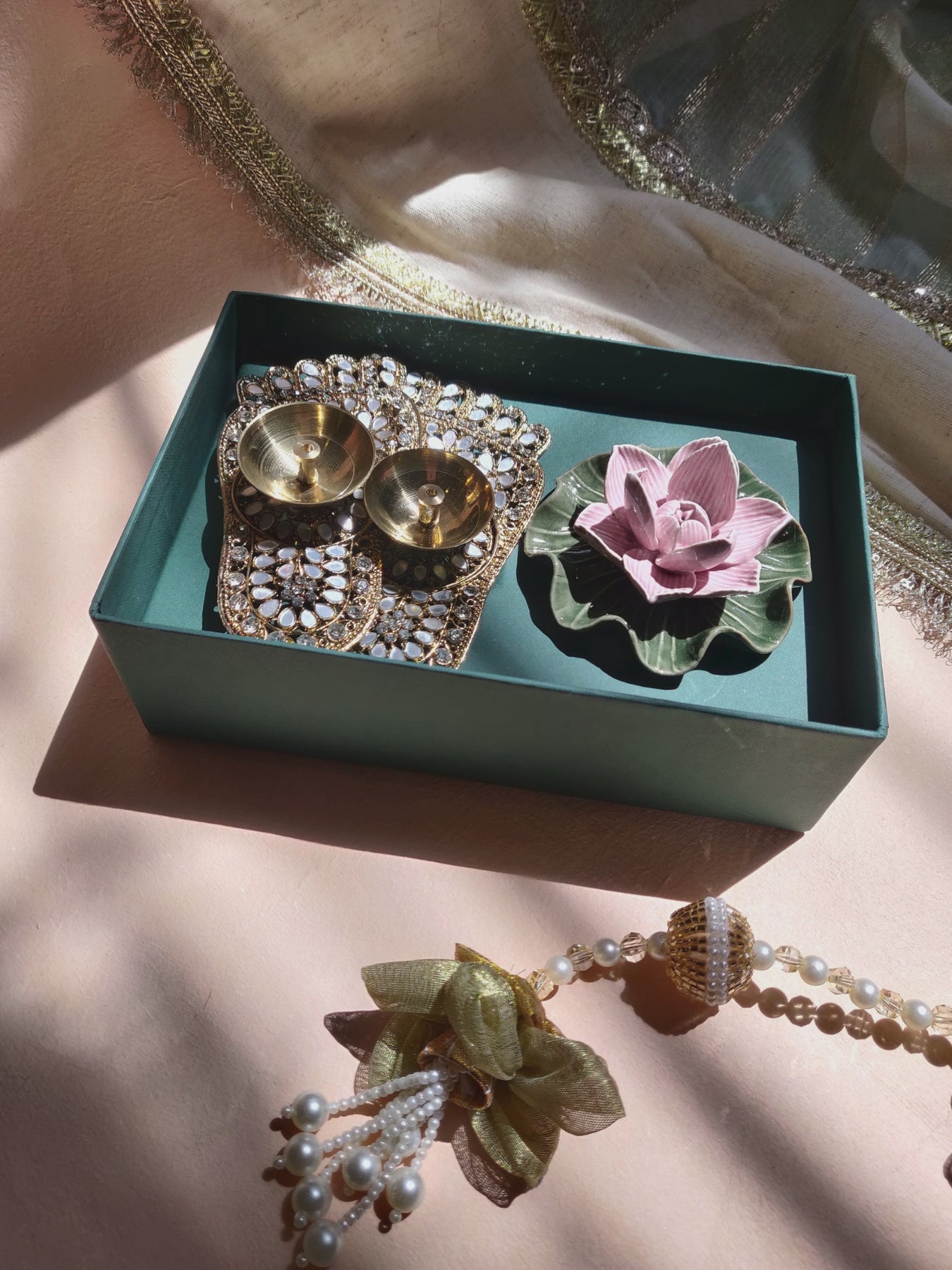 A soulful festive hamper featuring a Lotus Agarbatti Stand and Lakshmi Charan Mirror Diya - perfect to light up your pooja space with positivity and grace.
