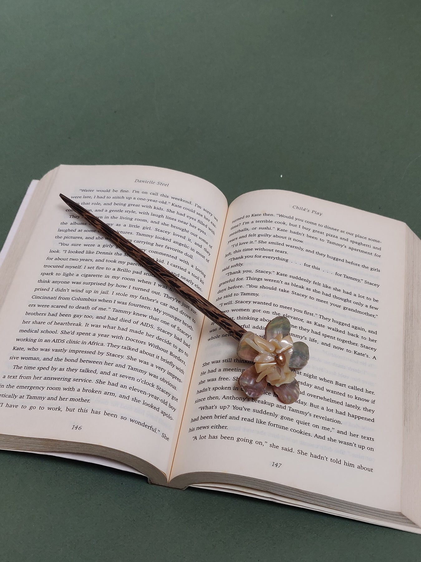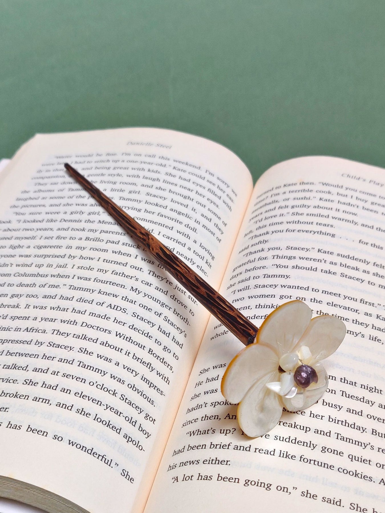 Our handcrafted wooden juda stick adorned with a delicate mother-of-pearl flower — where natural charm meets sophistication.